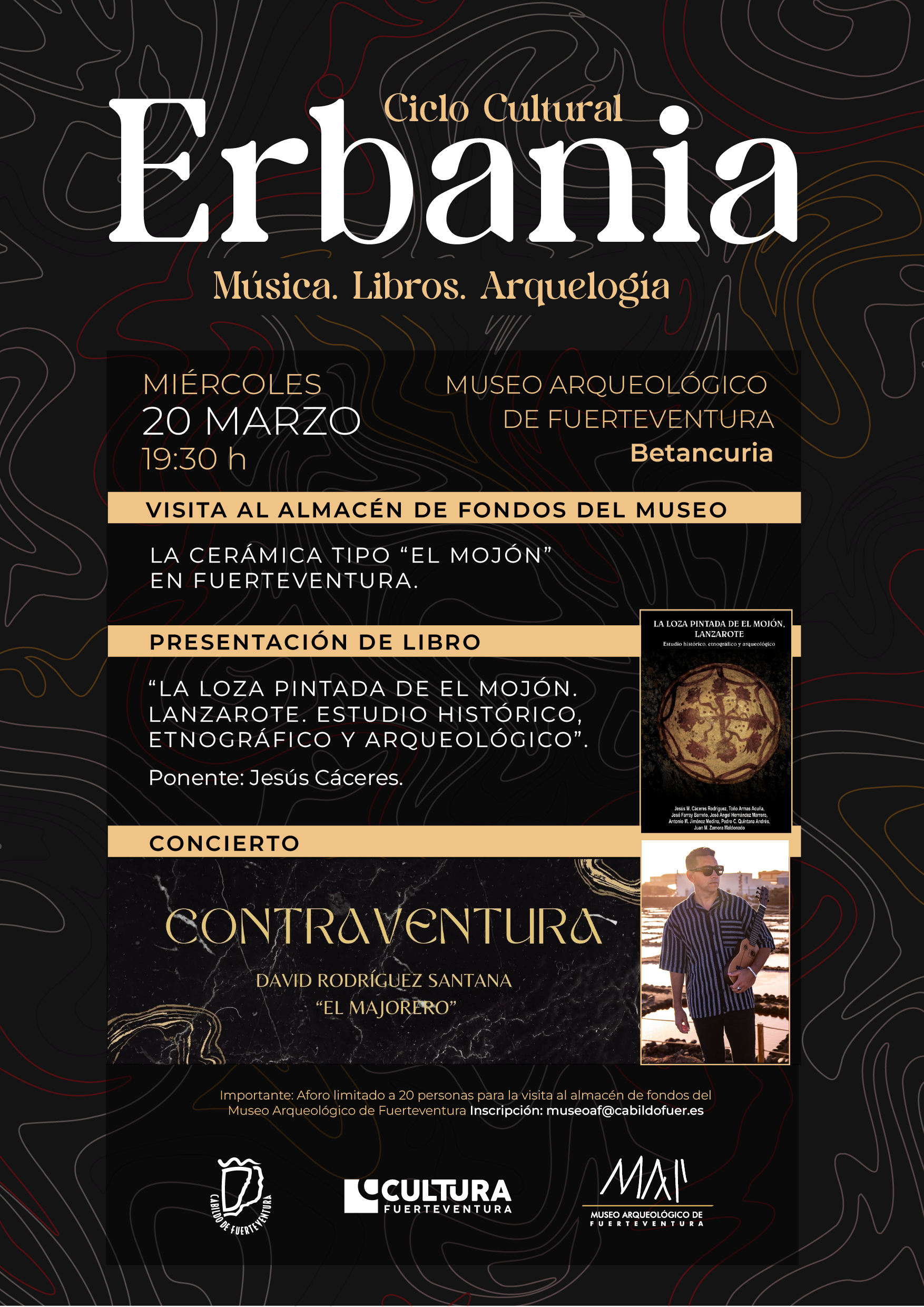 La programación comenzará el próximo miércoles, 20 de marzo, a partir de las 19.30 horas, con una visita al almacén de fondos del museo, donde los asistentes podrán conocer de primera mano los hallazgos en Fuerteventura de la cerámica tipo ‘El Mojón’, de Lanzarote, materiales que serán explicados por el arqueólogo Jesús Cáceres, que seguidamente presentará el libro La Loza pintada de El Mojón. Lanzarote. Estudio histórico, etnográfico y arqueológico. En el caso de la visita al almacén de fondos, es necesaria la inscripción a través del correo museoaf@cabuildofuer.es.