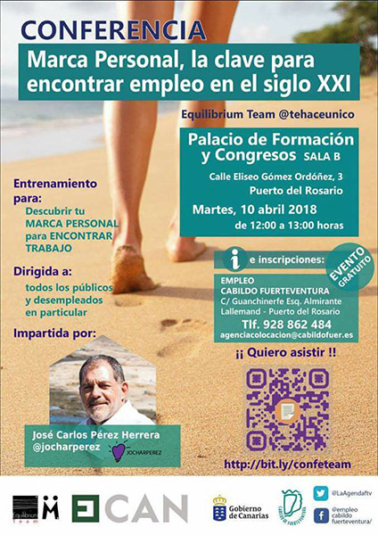 La consultora Equilibrium Team ofrecerá este mes de abril en el Palacio de Formación y Congresos de Fuerteventura un taller y una conferencia sobre como potenciar la marca personal para encontrar empleo, dirigidos a público general y personas interesadas en alcanzar un nuevo y mejor puesto de trabajo.