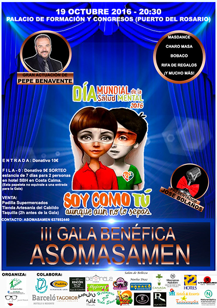 El Cabildo de Fuerteventura, a través de la Consejería de Bienestar Social, el Servicio de Salud Mental del Área de Salud de Fuerteventura, la Mancomunidad de Municipios del Centro Sur de Fuerteventura, y la Asociación Majorera por la Salud Mental (Asomasamen), han elaborado un programa de actos para conmemorar el Día Mundial de la Salud Mental. El Palacio de Formación y Congresos de Fuerteventura acogerá el próximo 19 de octubre, a las 20.30 horas, la III Gala Benéfica Asomasamen, que contará con la actuación central de Pepe Benavente. Las entradas se pueden adquirir en la Tienda de Artesanía del Cabildo, en la calle Primero de Mayo, y en los Supermercados Padilla.