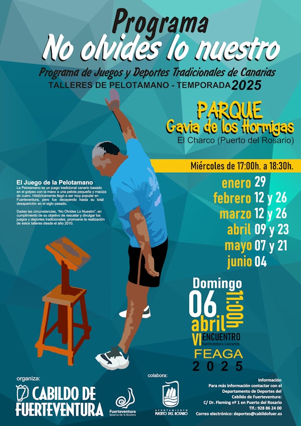 El próximo miércoles día 26 de febrero, de 17:00 h. a 18:30 h., se celebrará en el Parque “Gavia Los Hormiga” de El Charco, y gracias a la colaboración del Ayuntamiento de Puerto del Rosario, el tercer Taller de Pelotamano del presente año 2025, organizado por la Consejería de Deportes del Cabildo de Fuerteventura, enmarcado en su Programa “No Olvides Lo Nuestro”.