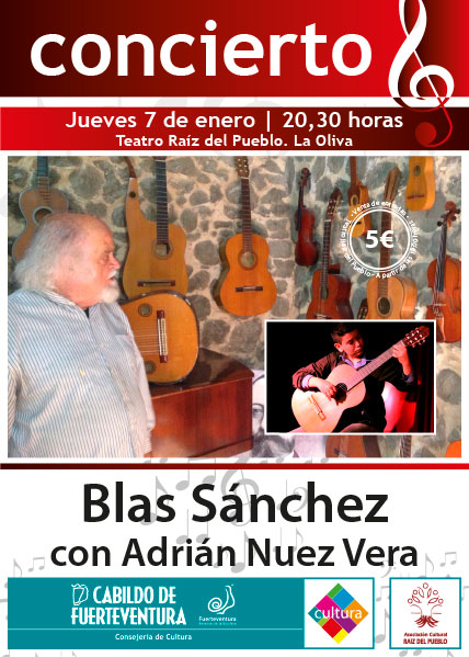 El Teatro Raíz del Pueblo de La Oliva acoge hoy, jueves, 7 de enero, el concierto del joven guitarrista Adrían Nuez Vera, acompañado de su maestro, el músico y artista grancanario Blas Sánchez, en un concierto titulado ‘Aventuras de un trovador canario en París, con mala pata’. El evento tendrá lugar a las 20.30 horas, dentro de las actividades incluidas en la Agenda de Cultura del Cabildo de Fuerteventura. Las entradas pueden adquirirse, por un precio de 5 euros, en la taquilla del teatro, desde las 19.00 horas.