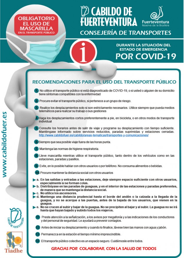 El Cabildo recuerda que se debe procurar evitar el transporte público, sobre todo si se forma parte de un grupo de riesgo, y que en caso de hacerlo viaje fuera de horas punta siempre que sea posible, mantenga las normas de higiene y sanitarias, evite en lo posible hablar con otros usuarios y use mascarilla obligatoriamente, tanto dentro de los vehículos como en las estaciones, paradas y pasillos