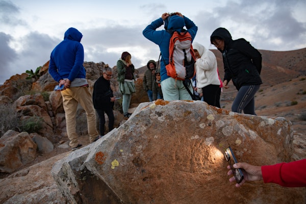Posteriormente, se desarrolló una visita al Morro del Humilladero, uno de los yacimientos que pronto serán visitables en Fuerteventura. Los asistentes pudieron disfrutar de la puesta de sol en un día especial para las culturas aborígenes de las islas y realizar una observación nocturna de sus grabados podomorfos.