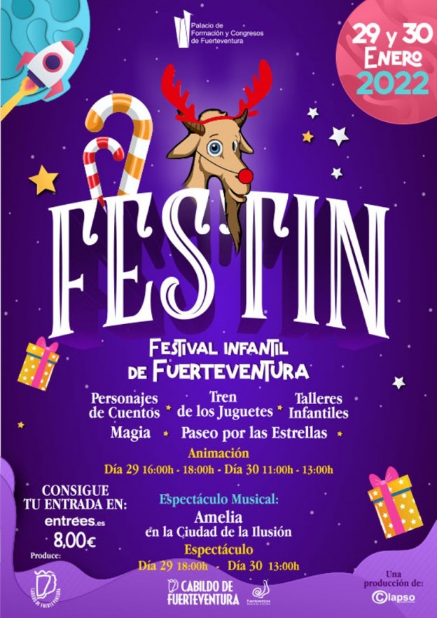 El FESTIN-Festival Infantil de Fuerteventura llega al Palacio de Formación y Congresos los próximos días 29 y 30 de enero con actividades variadas, así como el espectáculo musical Amelia en la Ciudad de la Ilusión. Las entradas ya pueden adquirirse en la plataforma entrees.es.