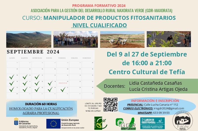 La Consejería de Agricultura, Ganadería y Pesca del Cabildo de Fuerteventura y la Asociación para la Gestión del Desarrollo Rural Maxorata Verde (GDR-Maxorata), han lanzado una nueva edición del curso Manipulador de Productos Fitosanitarios – Nivel Cualificado. Esta formación, dirigida a profesionales del sector agrario, se llevará a cabo en el Centro Cultural de Tefía del 9 al 27 de septiembre de 2024, de 16:00 a 21:00 horas.