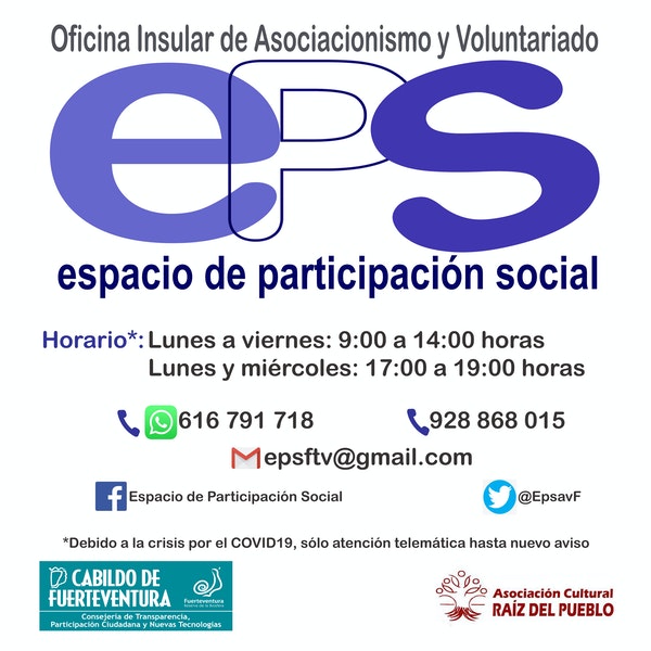 El horario de atención, en las actuales circunstancias, será de lunes a viernes de 9:00 a 14:00 horas, y los lunes y miércoles en horario de tarde de 17:00 a 19:00 horas en los teléfonos 616791718 y 928868015 o bien escribiendo al correo epsftv@gmail.com o en las redes sociales