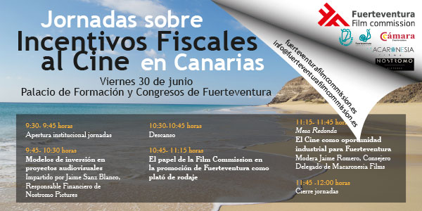 Fuerteventura Film Commission, adscrita al Cabildo de Fuerteventura, celebrará este viernes, día 30 de junio, unas jornadas sobre incentivos fiscales al cine en Canarias. El evento, que se celebrará en el Palacio de Formación y Congresos, tiene como objetivo explicar al empresariado y al público, en general, el funcionamiento de estos incentivos fiscales. Las jornadas se desarrollarán en coordinación con la Cámara de Comercio de Fuerteventura y las productoras Macaronesia Films y Nostrodomo Pictures, productora de la película Palmeras en la nieve.