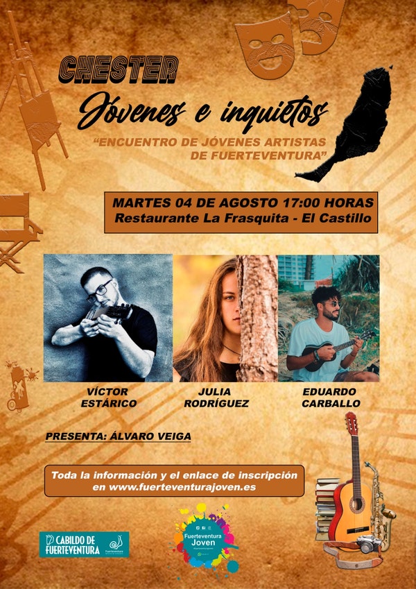 Bajo el nombre ‘Chester Jóvenes e Inquietos: Encuentro de Jóvenes Artistas de Fuerteventura’, un total de seis jóvenes artistas de la Isla se darán a conocer y mostrarán su talento, con la grabación de dos encuentros que se difundirán en los medios de comunicación y redes sociales.