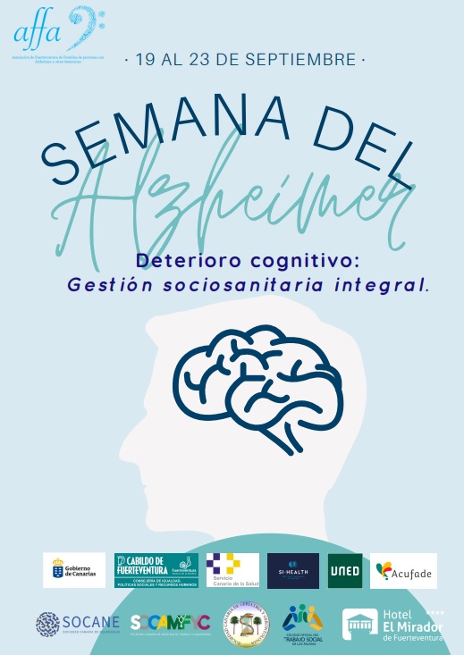 La Asociación de Fuerteventura de Familias de personas con Alzheimer y otras demencias (AFFA) organiza las I Jornadas Azlheimer Fuerteventura, contando con la colaboración de la Consejería de Políticas Sociales del Cabildo de Fuerteventura. Las jornadas se celebrarán del 19 al 23 de septiembre en las dependencias de la UNED, en el Palacio de Formación y Congresos de Fuerteventura, y se centrarán en la gestión sociosanitaria integral del deterioro cognitivo.