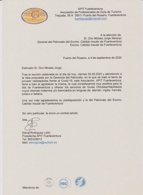 La Asociación de Profesionales de Guía de Turismo, APIT Fuerteventura, ha aceptado la propuesta del Patronato de Turismo de Fuerteventura para proveer ‘rastreadores turísticos’ que trabajen en la localización de posibles positivos del Covid-19 entre los turistas internacionales que visitan la Isla. La presidenta de APIT Fuerteventura, Elena Rodríguez, ha agradecido la iniciativa al Patronato de Turismo, la cual considera “muy positiva para Fuerteventura”.