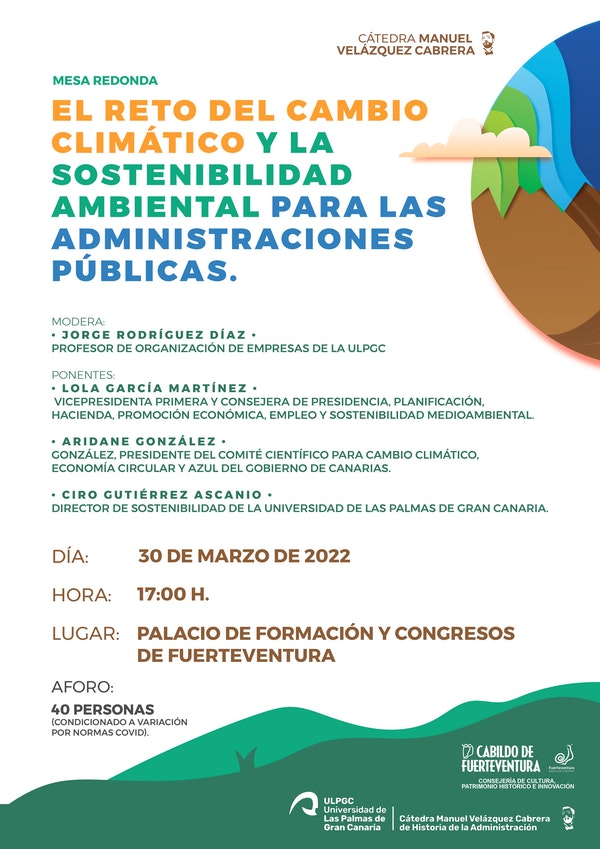 La Cátedra Manuel Velázquez Cabrera del Cabildo de Fuerteventura y la Universidad de Las Palmas de Gran Canaria desarrolla este miércoles, 30 de marzo, la mesa redonda Reto del Climático y la Sostenibilidad Ambiental para las Administraciones Públicas. El evento dará comienzo a las 17.00 horas, en el Palacio de Formación y Congresos de Fuerteventura, y abierto al público general, siendo necesario inscribirse en la agenda de la web cabildofuer.es