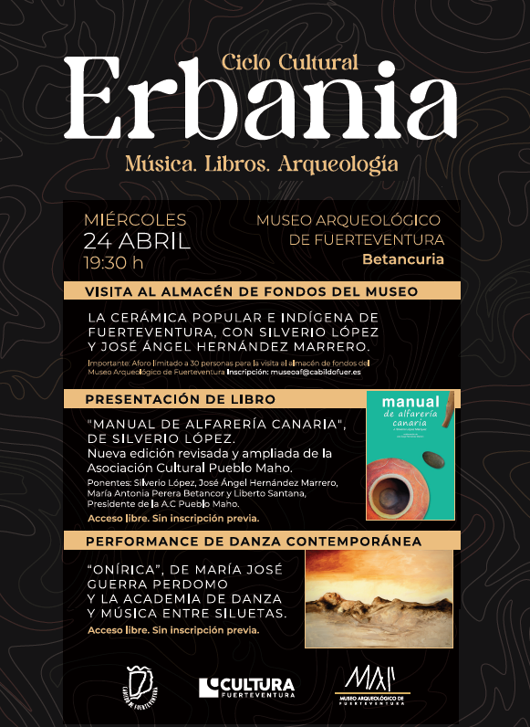 La segunda sesión del Ciclo Erbania Cultural dará comienzo a las 19.30 horas del 24 de abril, con una visita al almacén del museo en la que los alfareros Silverio López y José Ángel Hernández explicarán la cerámica popular e indígena de Fuerteventura a través de piezas custodiadas en el espacio museístico. Para esta visita es necesaria una inscripción previa en el correo electrónico museoaf@cabildofuer.es.