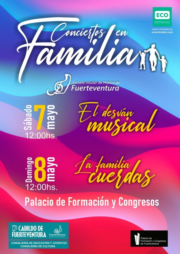 Las actuaciones tendrán lugar en el Palacio de Formación y Congresos los días 7 y 8 de mayo y el acceso será gratuitoLa Escuela Insular de Música presenta ‘Conciertos en familia’, una serie de dos actuaciones destinadas al público familiar de todas las edades que tendrán lugar los días 7 y 8 de mayo, a las 12 del mediodía, en el Palacio de Formación y Congresos de Fuerteventura, en Puerto del Rosario. Ambos conciertos son de acceso libre, previa reserva de entradas a través de la web www.ecoentradas.com.