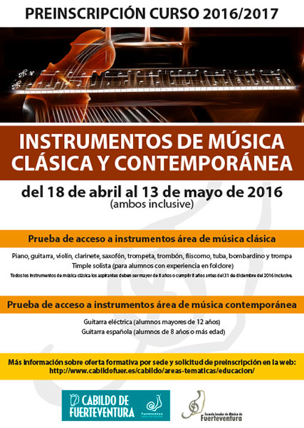 La Escuela Insular de Música, dependiente del Cabildo de Fuerteventura, ha abierto hoy, lunes, 18 de abril, el plazo de preinscripción en el área de música clásica y contemporánea para el curso 2016-2017. Los interesados tendrán hasta el 13 de mayo para entregar sus solicitudes.