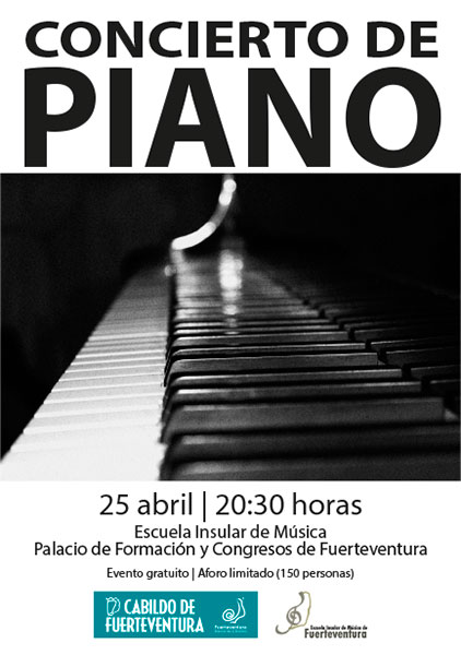 Alumnos y profesores de la Escuela Insular de Música, dependiente de la Consejería de Educación del Cabildo de Fuerteventura, que dirige Juan Jiménez, ofrece hoy lunes, 25 de abril, un concierto de piano, en sus dependencias del Palacio de Formación y Congresos. El evento comenzará a las 20.30 horas.