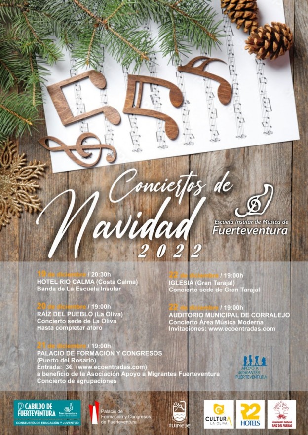 El miércoles 21 de diciembre, las diferentes agrupaciones la sede de Puerto del Rosario de la Escuela Insular de Música darán un concierto benéfico en favor de la Asociación Apoyo a Migrantes de Fuerteventura. El evento se desarrollará en el Palacio de Formación y Congresos a las 19.00 horas. Todas las personas interesadas en asistir y colaborar podrán adquirir su entrada a través de www.ecoentradas.com aportando un donativo de 3 euros.