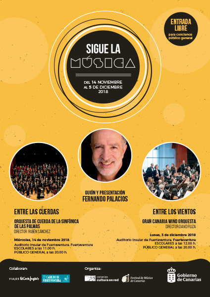 El proyecto ‘Sigue la Música’ es una iniciativa de la Consejería de Turismo, Cultura y Deportes, a través de Canarias Cultura en Red y con la colaboración de Viajes El Corte Inglés, con la que se pretende contribuir a la formación de nuevos públicos en las islas. El circuito está concebido para que el público se adentre en el maravilloso universo de la música, los instrumentos, compositores, cada historia contada detrás de una partitura, a través de un guion ameno, entretenido y divertido. Concebido además para espectadores de todas las edades, para familias y cualquier persona que tenga interés en conocer un poco más lo que escucha.