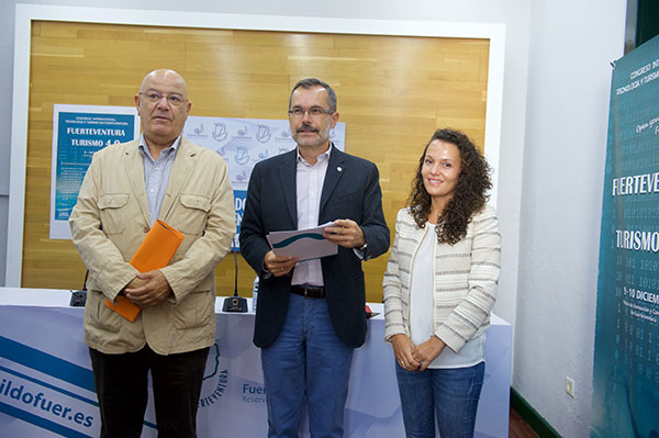 El presidente del Cabildo de Fuerteventura, Marcial Morales, la consejera de Transparencia y Nuevas Tecnologías, Ylenia Alonso, y el presidente de la Asociación de Empresarios Turísticos de Fuerteventura (Asofuer), Antonio Hormiga, presentaron hoy, jueves, día 27 de octubre, esta convención que persigue, entre otras acciones, «dar las claves para aplicar la tecnología al alcance del sector a la industria turística de la Isla», según coincidieron en señalar.