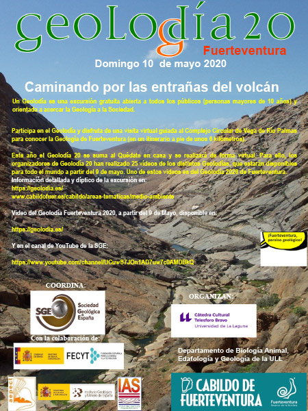 Se trata de una oportunidad de conocer de modo ameno y sencillo los valores geológicos de nuestra tierra a través de la web del Geolodía (https://geolodia.es/) y en el canal de Youtube SGE https://www.youtube.com/channel/UCuwS7JOn1AD7uw7c0AMDBkQ, y que incluye una visita virtual al Geolodía 2020 de Fuerteventura, dedicado este año al Complejo Circular de Vega de Río Palmas.