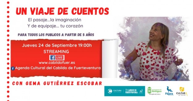 La narradora Gema Gutiérrez ofrecerá este jueves, día 24 de septiembre, la actividad ‘Un viaje de cuentos’, vía streaming desde el Centro Cultural de Toto (municipio de Pájara). Este evento, dirigido a todos los públicos a partir de los cinco años, tendrá lugar a las 19.00 horas.