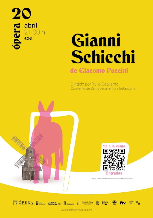 La asociación ÓperaFuerteventura G. Verdi llevará este sábado, 20 de abril, la obra Gianni Schicchi de G Puccini al Convento de San Buenaventura de Betancuria. Se trata de una ópera cómica en un acto con orquesta y solistas de nacionales e internacionales que homenajea el centenario de la muerte de Puccini.