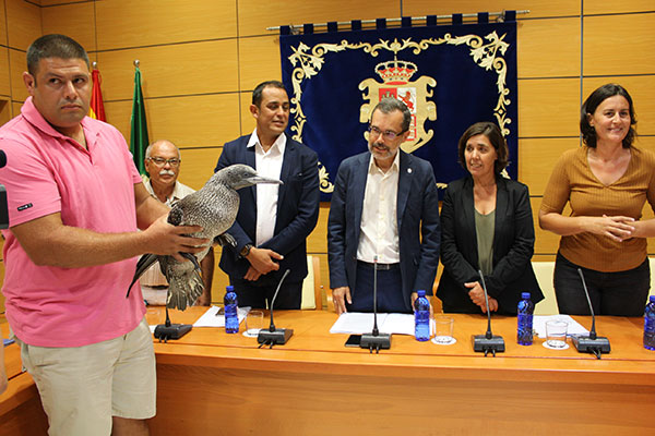 La Sociedad de Cazadores Los Halcones, de Antigua, entrega al Cabildo un pollo de alcatraz extraviado en su ruta hacia el Sur de África
