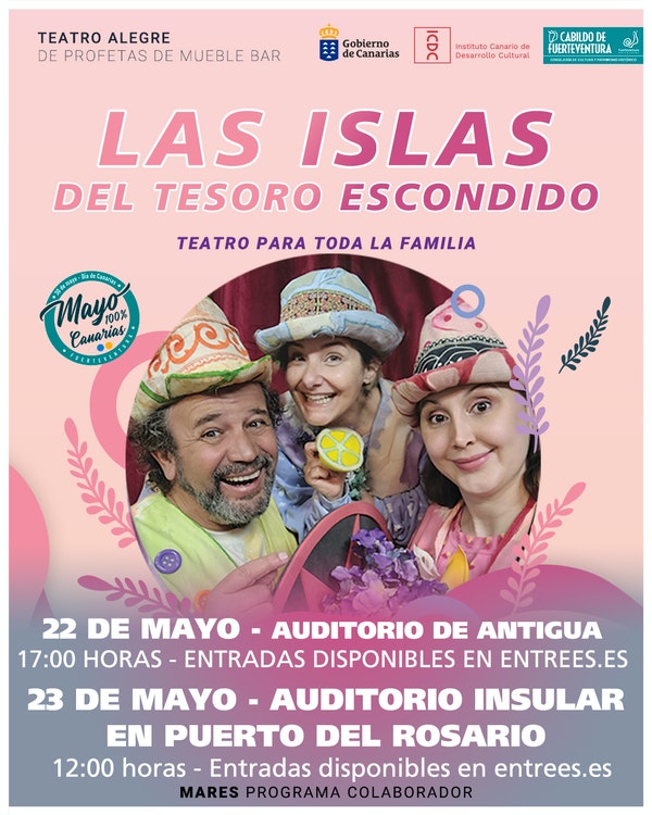 El Cabildo de Fuerteventura, a través de la Consejería de Cultura, acerca los autores canarios al público infantil con la obra de teatro familiar ‘Las islas del tesoro escondido’, de la compañía canaria Teatro Alegre de Profetas del Mueble Bar. Los pequeños descubrirán a escritores reconocidos como Benito Pérez Galdós, Tomás Morales, Agustina González y Tomás de Iriarte. Las representaciones tendrán lugar el sábado, día 22 de mayo, a las 17.00 horas, en el Auditorio de Antigua y el domingo, 23 de mayo, a las 12.00 horas, en el Auditorio Insular de Fuerteventura, y las entradas están a la venta en www.entrees.es.