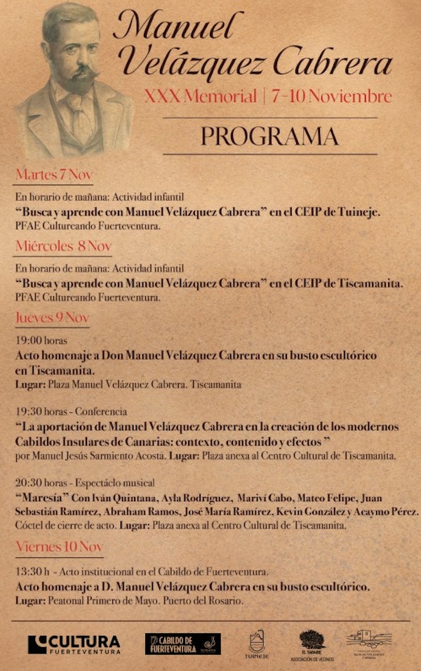 Para finalizar la programación de este memorial, el viernes, 10 de noviembre, a las 13.30 horas, se desarrollará el acto institucional del Cabildo de Fuerteventura en el busto escultórico de Manuel Velázquez Cabrera situado junto a la puerta principal de Casa Palacio.