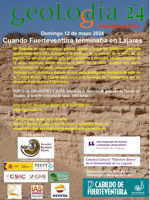 En el Caso del Geolodía Fuerteventura 2024 se cuenta con la colaboración de la Consejería de Medio Ambiente, Caza y Economía Circular del Cabildo de Fuerteventura, del Dpto. de Biología Animal, Edafología y Geología de la Universidad de La Laguna y de la Cátedra Cultural “Telesforo Bravo” del Vicerrectorado de Cultura y Extensión Universitaria de La Universidad de La Laguna. El Instituto Geológico y Minero de España, del Ministerio de Ciencia, Innovación y Universidades, y la Fundación Española para la Ciencia y la Tecnología, patrocinan esta actividad a nivel nacional, financiando en parte la actividad.