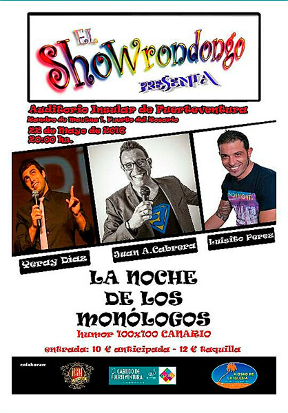 El Showrondongo presenta este espectáculo de monólogos, con humor cien por cien canario. La entrada, con un precio de 10 euros, puede adquirirse con antelación en la Tienda de Artesanía del Cabildo de Fuerteventura, en calle Primero de Mayo, o en la página web www.entrees.es.