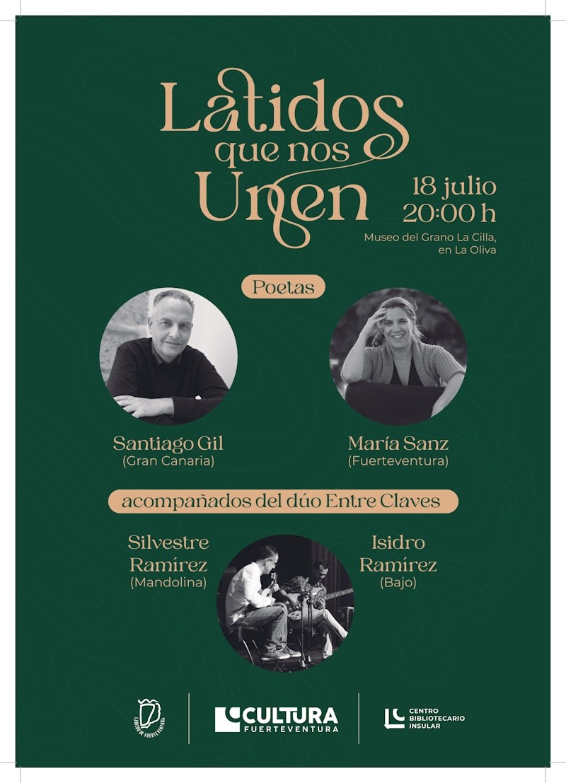 Los poemas de Santiago Gil (Gran Canaria) y María Sanz (Fuerteventura) aterrizan este jueves, 18 de julio, en un nuevo encuentro del ciclo ‘Latidos que nos unen’. Será a las 20.00 horas en el Museo del Grano, La Cilla, en La Oliva. Los poetas estarán acompañados por el dúo ‘Entre claves’, formado por los hermanos Ramírez: Isidro y Silvestre.