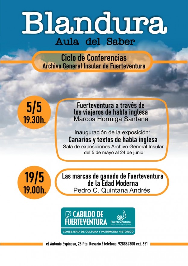 El Cabildo de Fuerteventura, a través de la Consejería de Cultura y Patrimonio Histórico, continúa con una nueva edición del ciclo de conferencias ‘Blandura: Aula del Saber’ en el Archivo General Insular de Fuerteventura. La próxima sesión tendrá lugar este jueves, día 5 de mayo, a las 19.30 horas, y correrá a cargo del autor Marcos Hormiga con la conferencia ‘Fuerteventura a través de los viajeros de habla inglesa’.