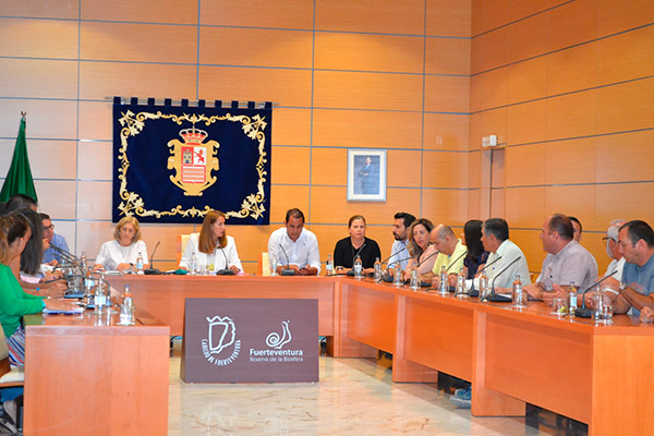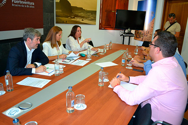 El presidente de Canarias en funciones, Fernando Clavijo, acompañado por la consejera de Educación y Universidades del Gobierno de Canarias en funciones, Soledad Monzón, analizó hoy con la presidenta del cabildo majorero, Lola García, la senda de crecimiento establecida para la planta educativa majorera en el Plan de Infraestructura Educativa 2018-2025
