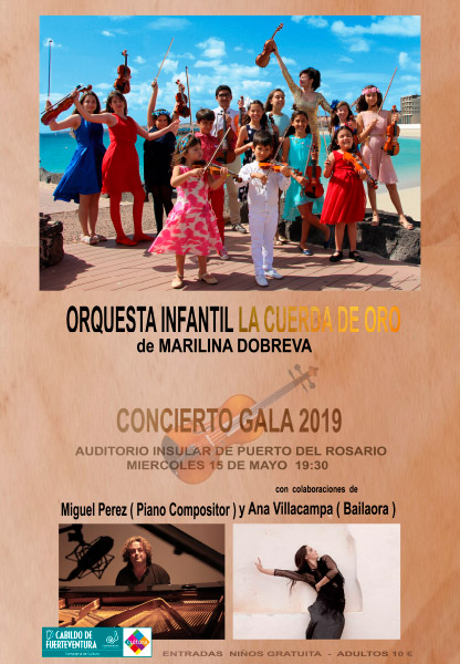 La Orquesta Infantil ‘La Cuerda de Oro’, dirigida por la violinista Marilina Dobreva, ofrecerá el miércoles, día 15 de mayo un Concierto Gala, a partir de las 19.30 horas, en el Auditorio insular, en Puerto del Rosario. El evento musical contará con las colaboraciones del pianista y compositor Miguel Pérez y de la bailaora Ana Villacampa.