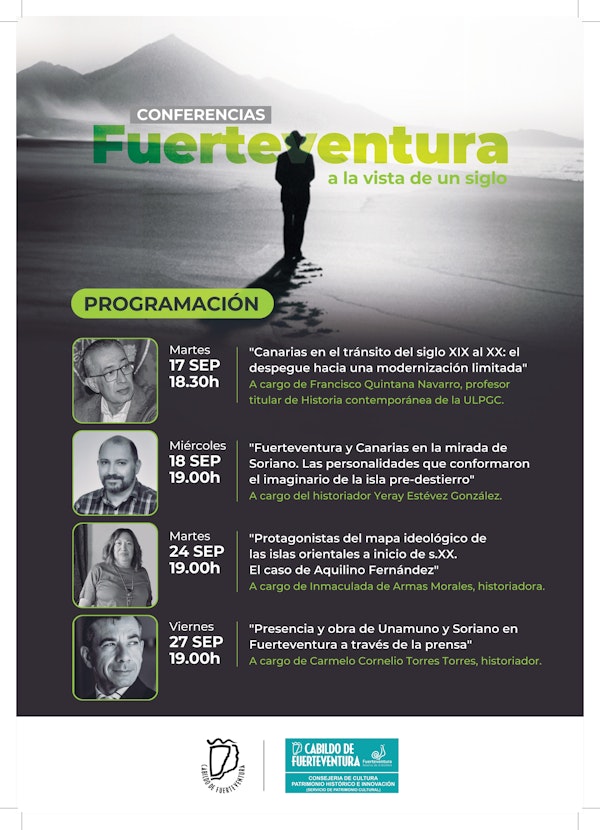 Patrimonio Cultural del Cabildo de Fuerteventura, que dirige Rayco León, ofrece el ciclo de conferencias ‘Fuerteventura a la vista de un siglo’. Una actividad que forma parte de la programación que la Consejería de Cultura ha organizado para conmemorar el centenario de la llegada de Miguel de Unamuno a la Isla. Las conferencias tendrán lugar en el Archivo General Insular y correrán a cargo de.