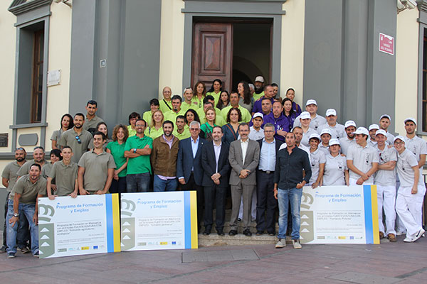 Sesenta personas desempleadas en Fuerteventura participan en tres proyectos de formación y empleo para obtener una experiencia laboral en trabajos de pintores, agricultores ecológicos y jardineros. El director general del Servicio Canario de Empleo (SCE), Alejandro Martín, y el presidente del Cabildo de Fuerteventura, Marcial Morales, recibieron hoy a estos 60 desempleados (45 alumnos trabajadores y 15 formadores) en un acto que se celebró en el Salón de Plenos de la Corporación insular y contó con la asistencia del consejero de Empleo de la Corporación insular, Rafael Páez, la consejera de Medio Ambiente, Natalia Évora, la consejera de Obras Públicas, Carreteras y Patrimonio, Edilia Pérez, el alcalde de Puerto del Rosario, Nicolás Gutiérrez, representantes de los ayuntamientos de Antigua y Tuineje, que son los tres municipios en los que se realizan estos tres Proyectos de Formación en Alternancia con el Empleo (PFAE).