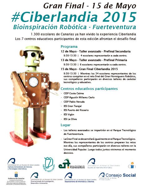 15 de mayo. Parque Tecnológico, Gran Final de Ciberlandia. 9.30-13.30. Mientras los 34 escolares representantes de los centros compiten en el reto final del Gran Hormiguero Robótico (en el Parque Tecnológico), sus compañeros participan en diversos talleres de carácter tecnológico y educativo (en el Centro Bibliotecario Insular). La Gran Final congregará a todos en el Parque Tecnológico.