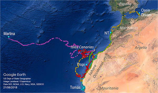 Por lo que respecta a las demás, Tomás alcanzó la costa africana una semana después de ser liberado y siguiendo hacia el sur se encuentra actualmente en la zona del Banco de Arguin (Mauritania), donde permanece desde hace cuatro meses. En cuanto a Tropi, fue nadando desde Fuerteventura hacia el oeste de La Gomera, pasó por el sur de La Palma, siguió su camino hacia el norte de Tenerife y terminó alejándose del archipiélago hacia el sur. Posteriormente volvió a las islas pasando por la costa norte de Gran Canaria. El pasado 23 de junio pasó a ocupar las aguas neríticas de la costa africana. Tras hacer una incursión en aguas oceánicas ha vuelto a aproximarse a la costa continental y actualmente se encuentra frente a la costa del Sahara Occidental. Por último, Martina permaneció durante dos meses en aguas próximas al archipiélago. Tras acercarse a las costas de Gran Canaria, La Gomera y El Hierro se desplazó por el oeste de las Islas y en estos momentos continúa alejándose, siguiendo una trayectoria hacia el oeste, cruzando el Atlántico.