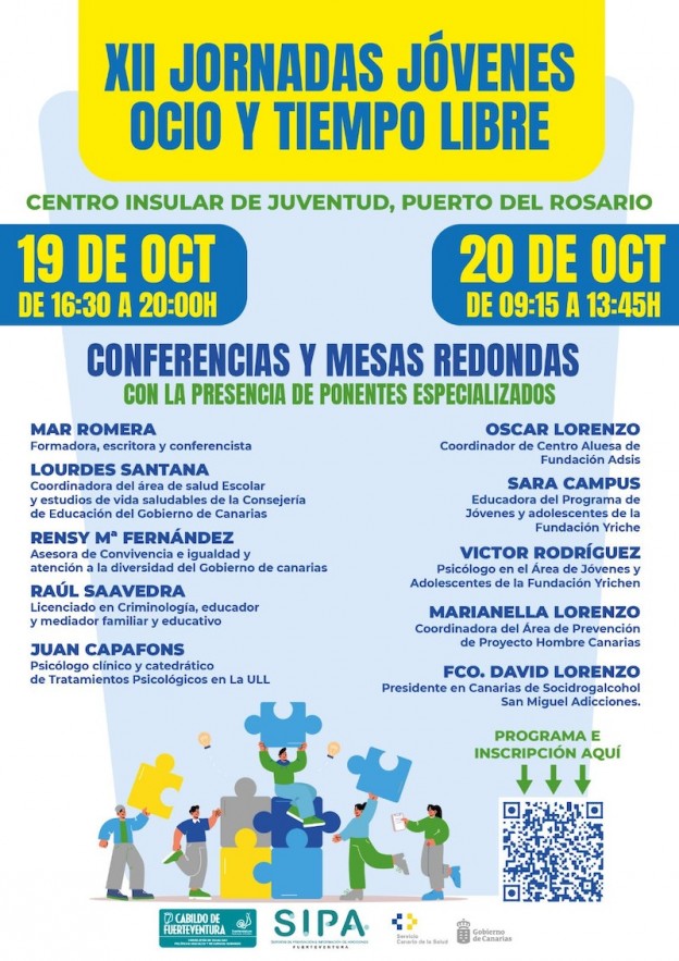 El Cabildo de Fuerteventura, a través de la Consejería de Políticas Sociales, recupera las jornadas formativas Jóvenes, Ocio y Tiempo Libre, con una decimosegunda edición enfocada a las adicciones tanto con sustancia como comportamentales o sin sustancia.  En esta ocasión tendrán lugar los días 19 y 20 de octubre en el Centro Insular de Juventud, dirigidas a agentes sociales y otros profesionales que deseen asistir.